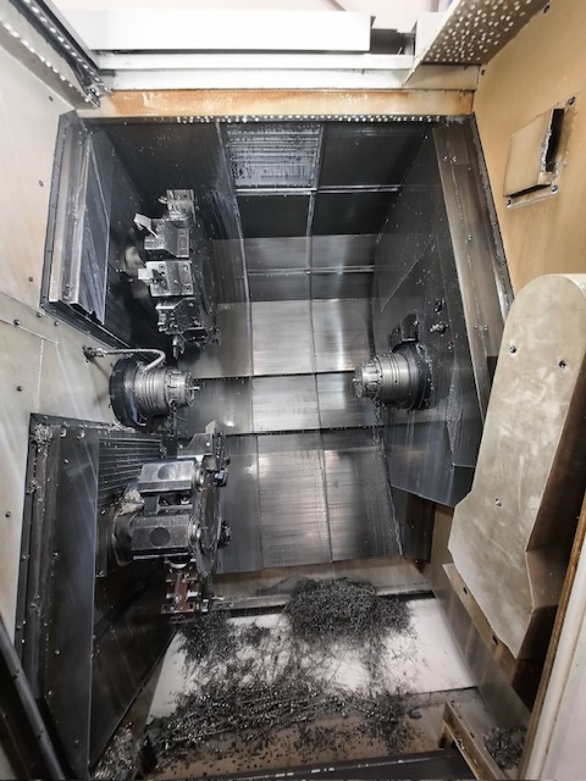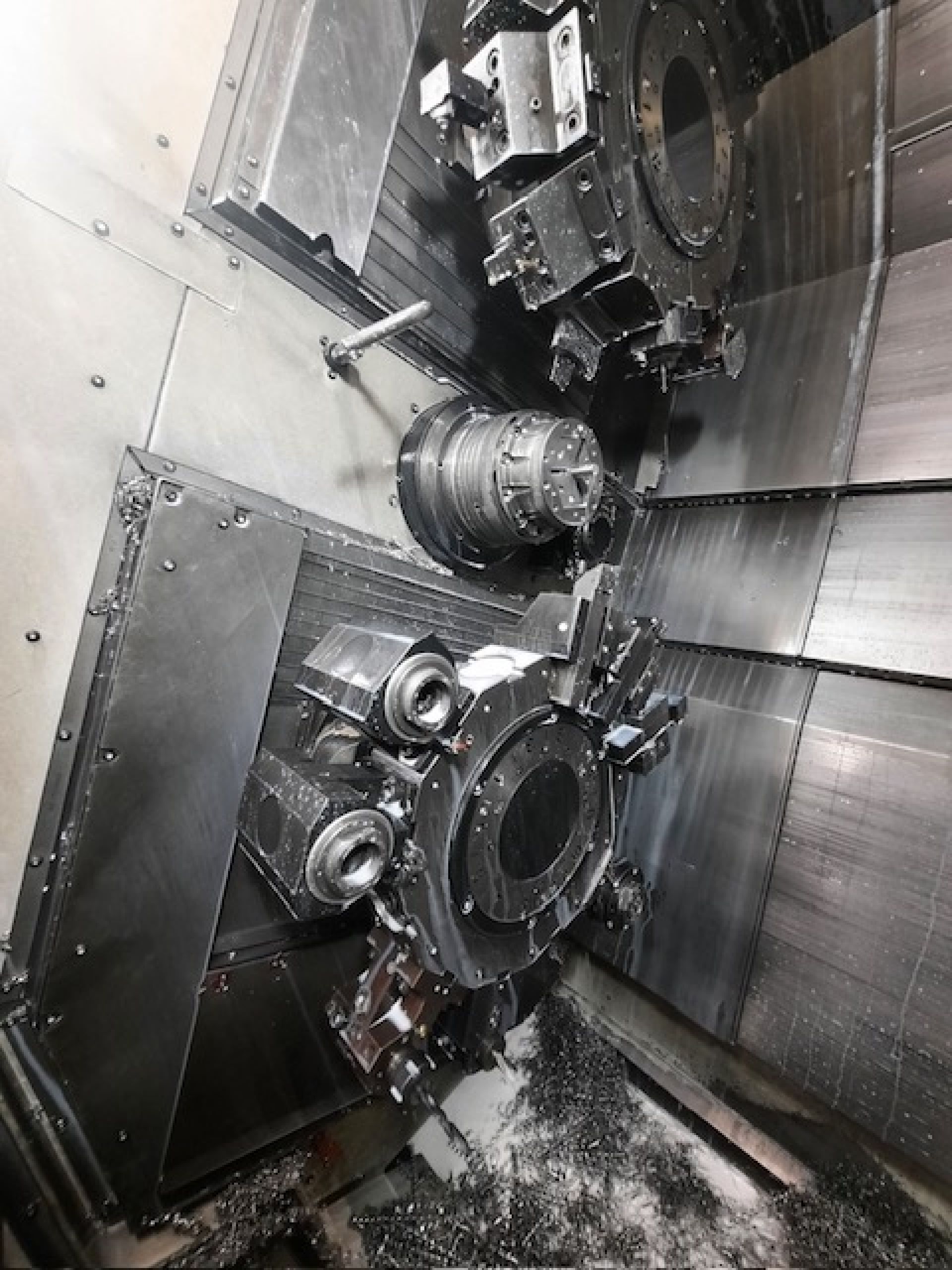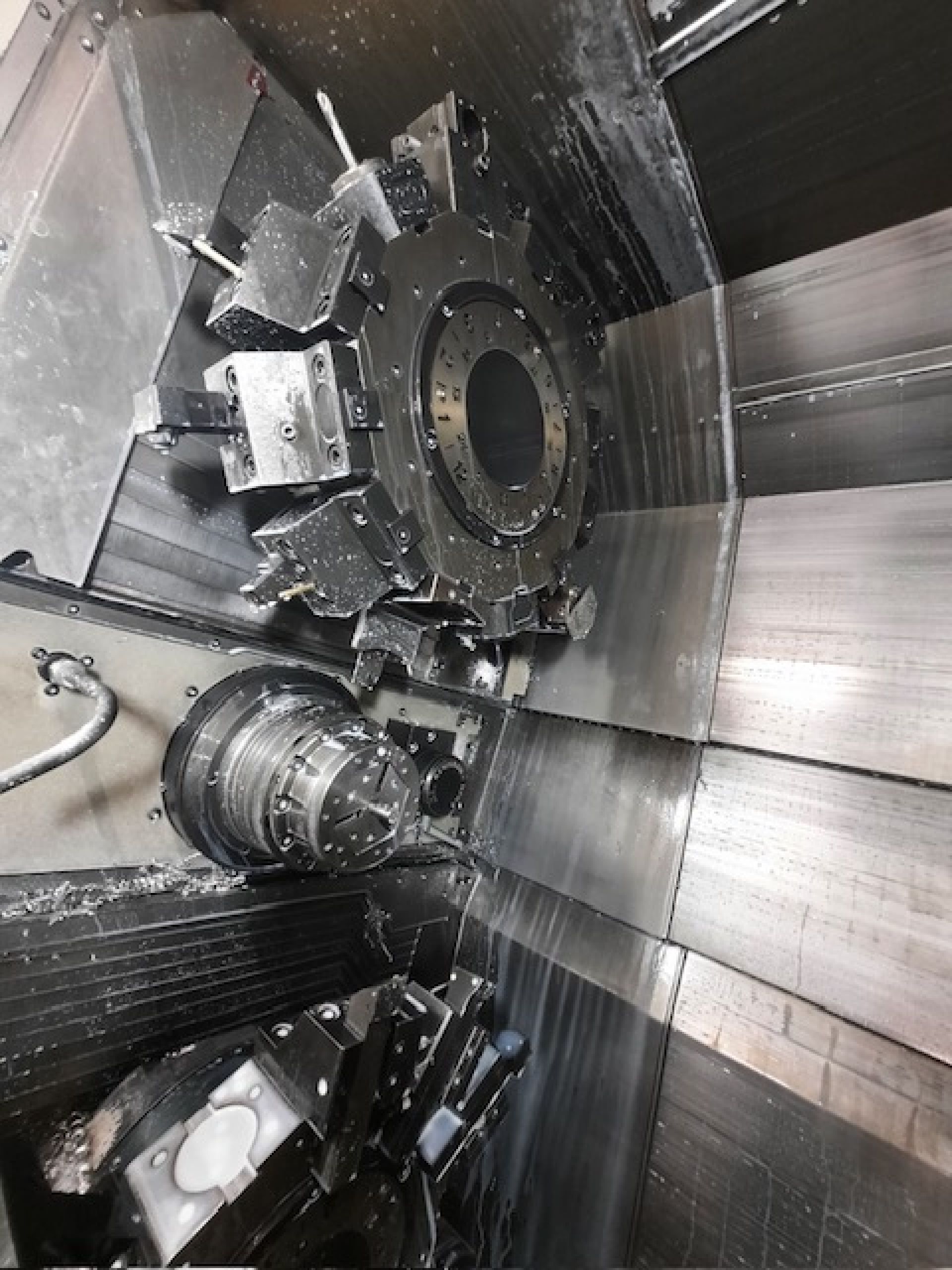 Questa macchina è un centro di tornitura e lavorazione CNC a doppio mandrino e doppia torretta, dotato di asse Y esteso, pensato per lavorazioni simultanee con più utensili e cicli complessi in ambienti industriali ad alta produzione.