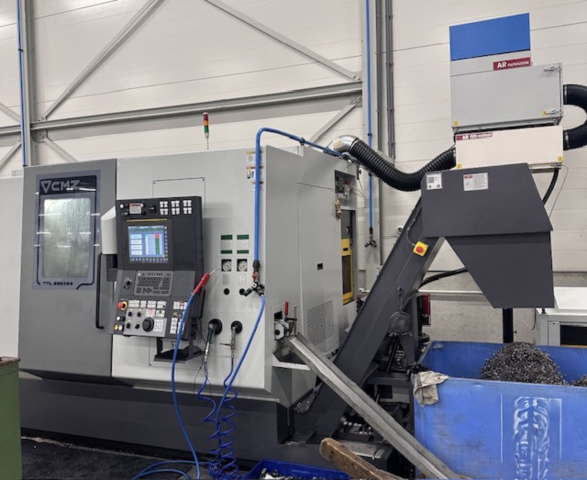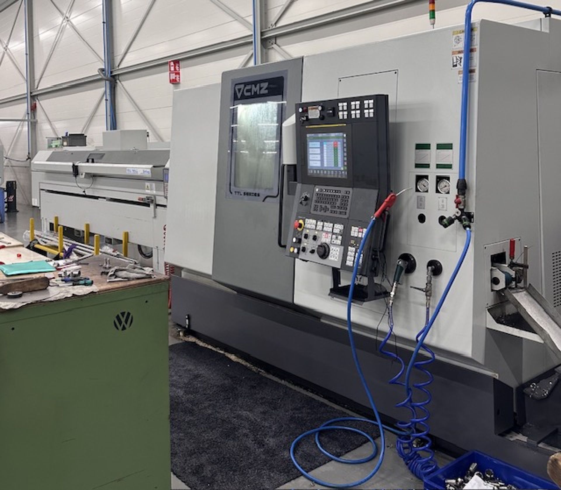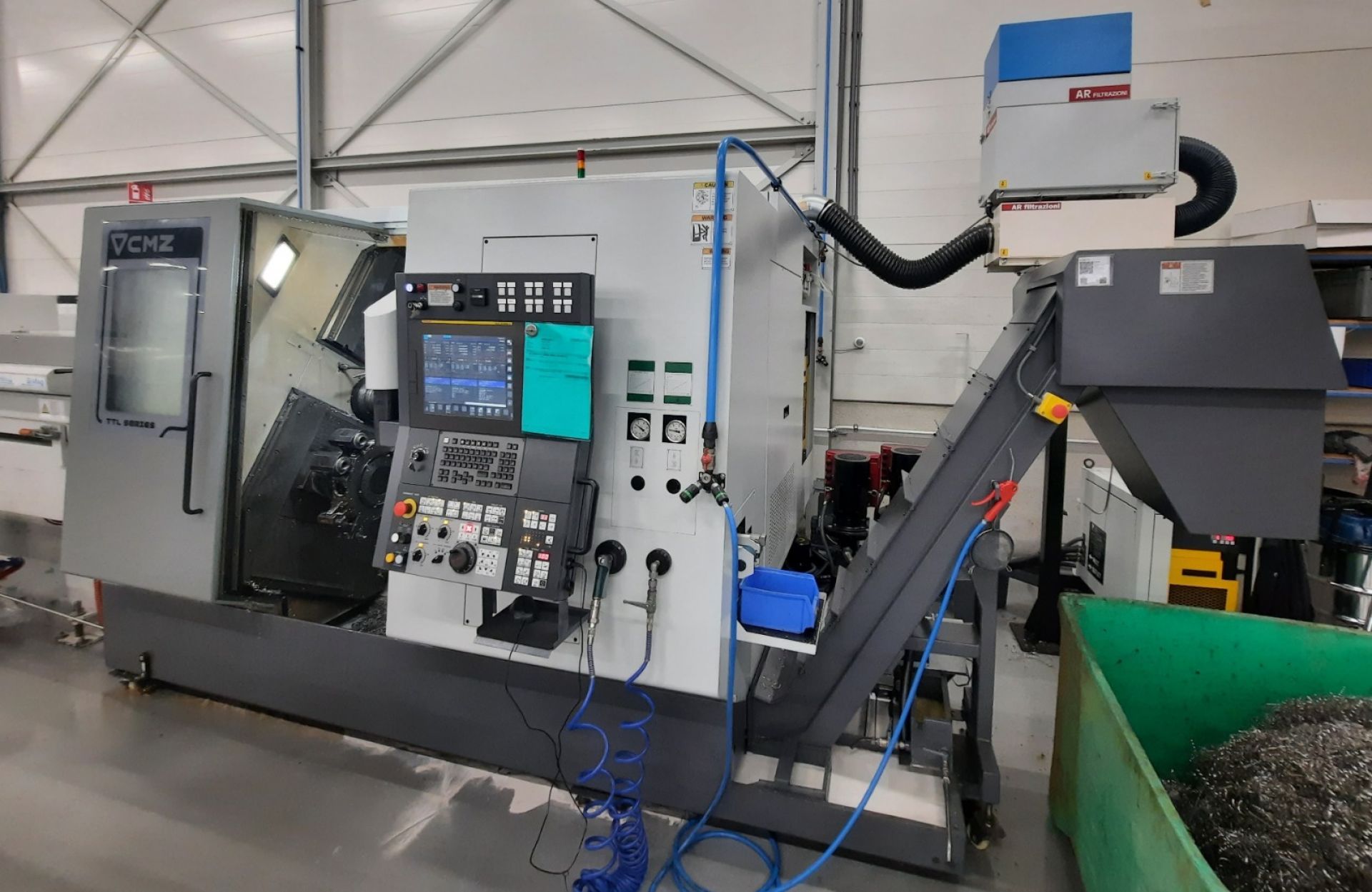 Questo CMZ TTL-52-52-T1Y-T2Y è un centro di tornitura e lavorazione CNC a doppio mandrino/doppia torretta con funzionalità estese dell'asse Y, progettato per pezzi torniti di medie dimensioni fino a Ø 220 mm e con corsa significativa in X, Y e Z. Supporta la lavorazione simultanea con più utensili e presenta una struttura robusta per ambienti ad alta produzione. Questa macchina è in ottime condizioni e ha circa 8200 ore di funzionamento effettive del mandrino. Controllo CNC Fanuc Serie 31i-Modello B Capacità massima di tornitura Ø 220 mm (tavola girevole) Max. Diametro di rotazione consentito Ø 240 mm Lunghezza di tornitura (tra i centri) 800 mm Corsa asse X1/X2 167,5 mm Corsa asse X3 (contromandrino) +120/–120 mm Corsa asse Z1/Z2 515 mm Corsa asse Z3 contromandrino 580 mm Velocità massima mandrino (principale/contromandrino) 4.500 giri/min Diametro esterno cuscinetto mandrino 150 mm Diametro interno cuscinetto mandrino 100 mm Punta mandrino (mandrino principale e secondario): ASA 6” (A2) X-as 30 m/min Z-as 30 m/min Y-as 20 m/min Compreso: Refrigerante attraverso il mandrino destro Contropunta nel mandrino destro (Versione breve) Presetter utensili rimovibile Convogliatore trucioli con uscita laterale Irco Breuning SIMAG 50.1-R-3000 bar feeder (Y2012) AR Filtrazioni collettore di nebbia Set grande (ca 50) Mandrini HAINBUCH Elenco completo delle opzioni nel documento allegato. Visione possibile su appuntamento. Disponibilità: 03/2026