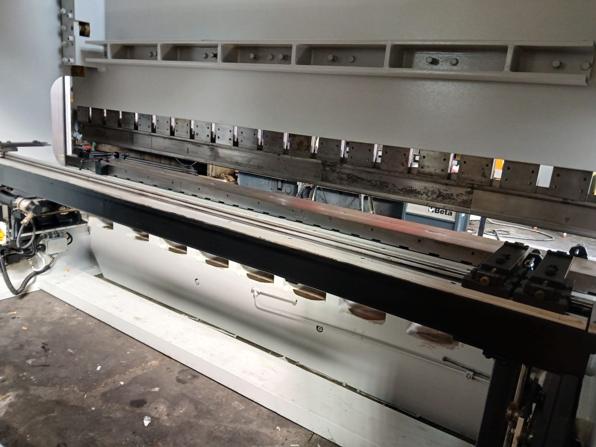 La pressa piegatrice FARINA 4100 x 320 ton è una macchina sincronizzata di alta capacità, perfettamente adatta alle esigenze di produzione industriale in lamiera. Grazie alla sua struttura robusta e alla trasmissione sincrona, è in grado di garantire uniformità e precisione anche su lotti voluminosi. È equipaggiata con 4 assi CNC (Y1, Y2, X, R) gestiti da un controllo Delem, che permette programmi avanzati e compensazioni automatiche di piega. La centinatura idraulica automatica integrata nella tavola inferiore assicura una deformazione controllata e costante durante la lavorazione, anche su lamiera spessa o pieghe lunghe.