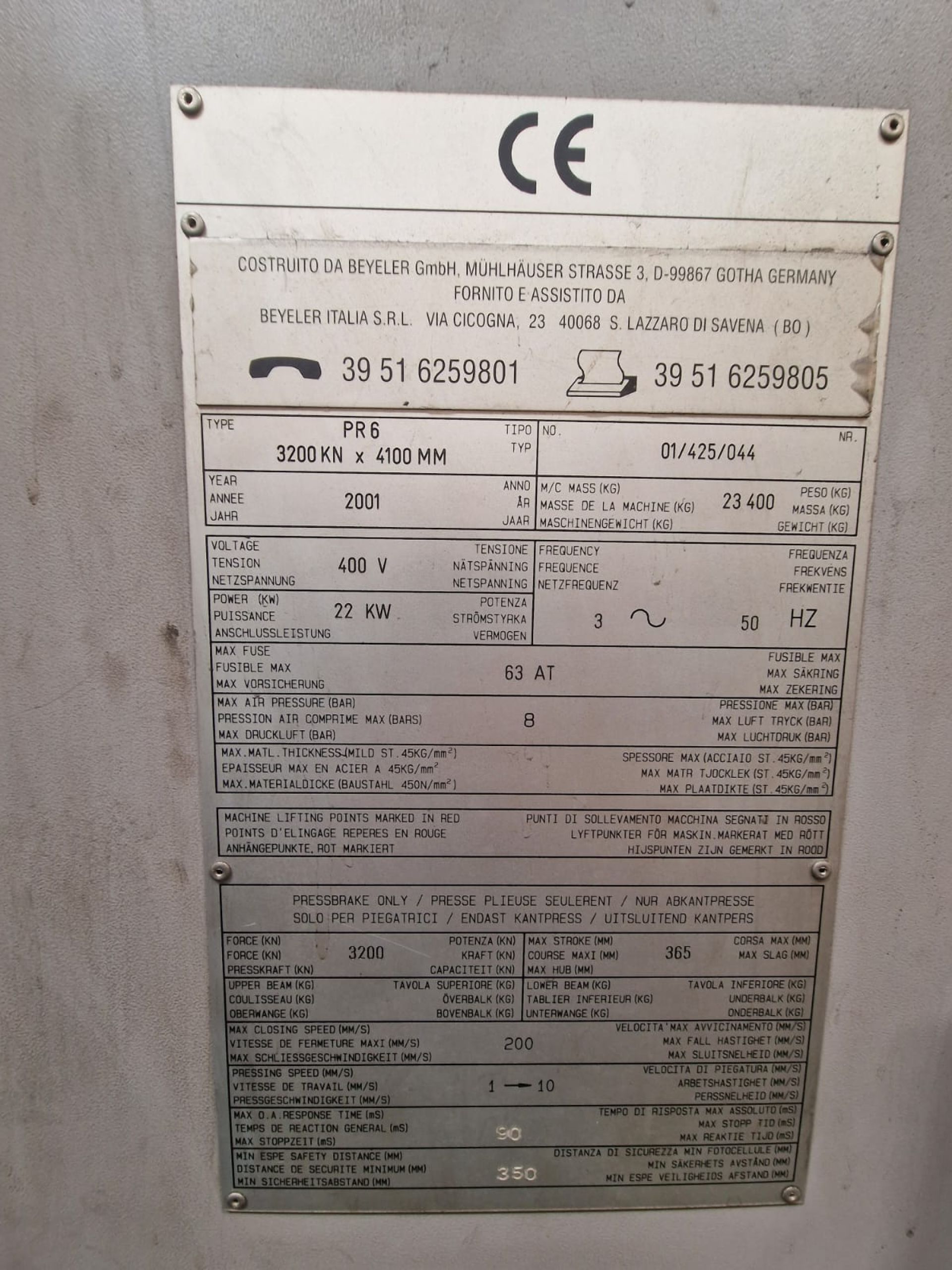 Potente, precisa e costruita per durare: la Beyeler / Bystronic PR6 4000 x 320 (2001) è una piegatrice da 320 ton che offre stabilità e qualità costante anche nelle lavorazioni più impegnative. Con 4 metri di lunghezza utile e controllo CNC Bystronic, è ideale per aziende che cercano una macchina solida e affidabile. Ora disponibile su OliverTools in versione verificata, con possibilità di supporto logistico completo.