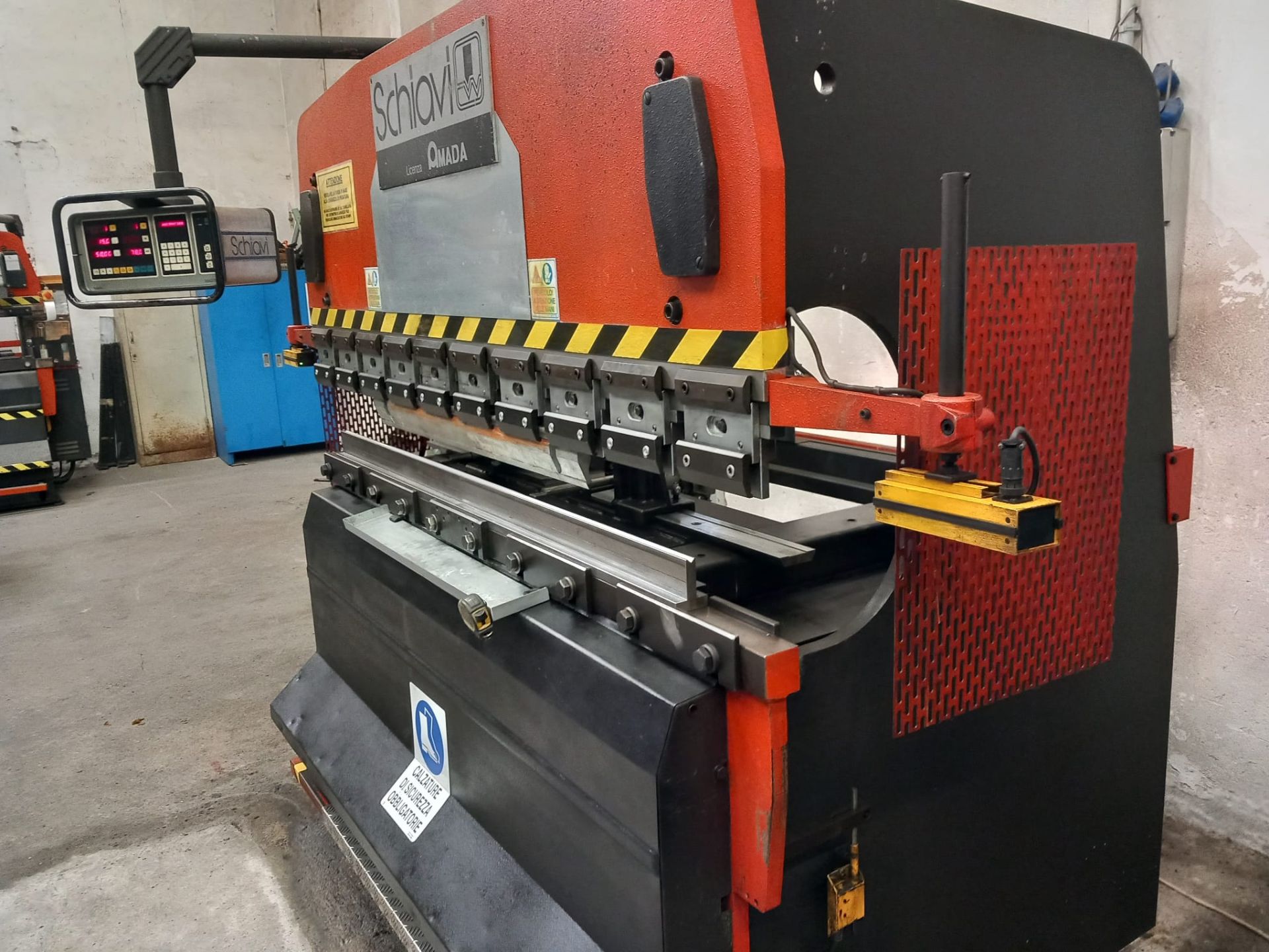 Pressa Piegatrice Schiavi Amada da 2000mm di tavola per 50 ton di forza, funzionante e tuttora collegata per prove di piega, completa di controllo Task Master 3 assi XYZ con fotocellule laterali e protezionie completa di utensili standard inferiori e superiori.